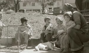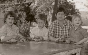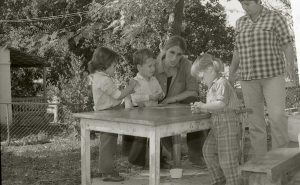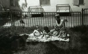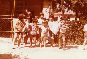 יעל שגיא וילדי הפעוטון על הדשא ליד בית התנוקות-1977