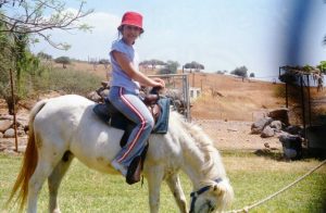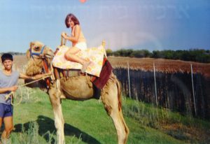 משק חי בית השטה דליה צבי מוליכה את הפוני עם רוכב קטן.2002