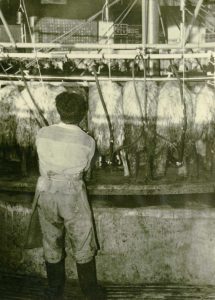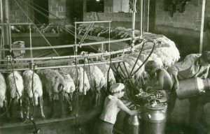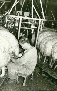 אמציה הדר חולב בדיר- בקרוסלה- חולב את מה שנשאר אחרי מכונת החליבה 1960