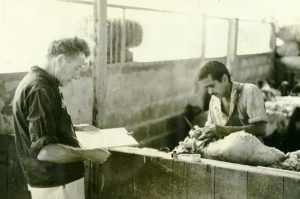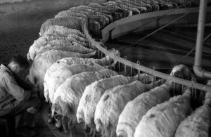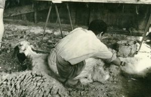 צאן גז אזורי בדיר שלנו. מאחור יהודית ארגוב מציירת את הגוזז- 1960