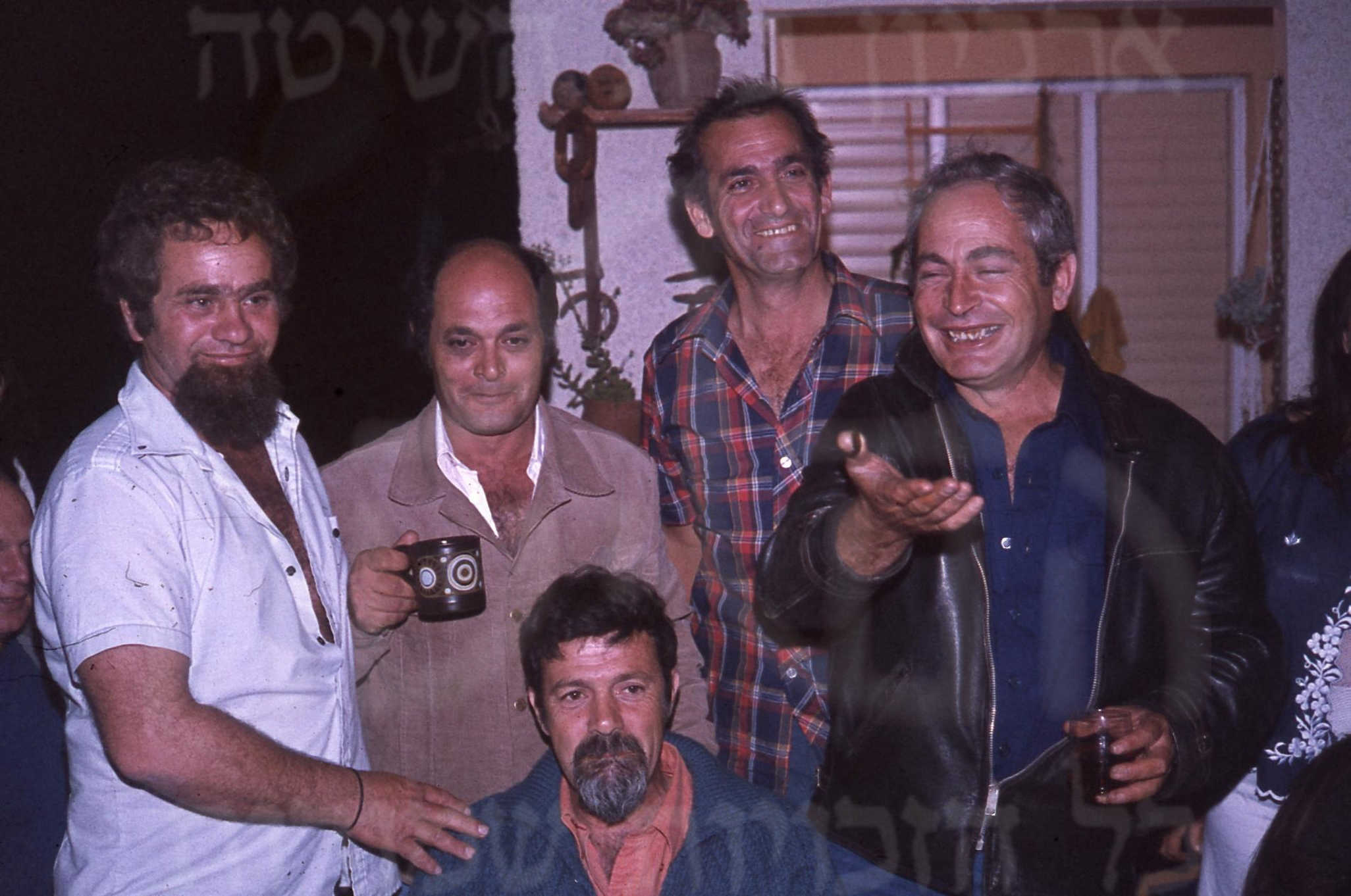 אלופי ההווי והסיפורים דוד ניסן,רן שריג,אהרון בצלאל,אברהם דואק ומוני מרוז ליד ביתם בשכונת אגם עילית.