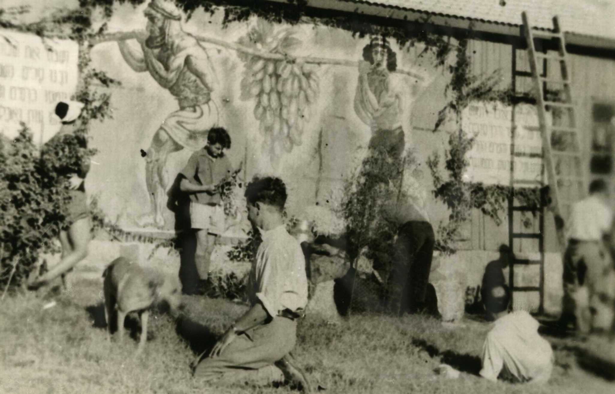 הבמה בחג השבועות , על קיר חדר האכל ציורי דוד א’. 1942