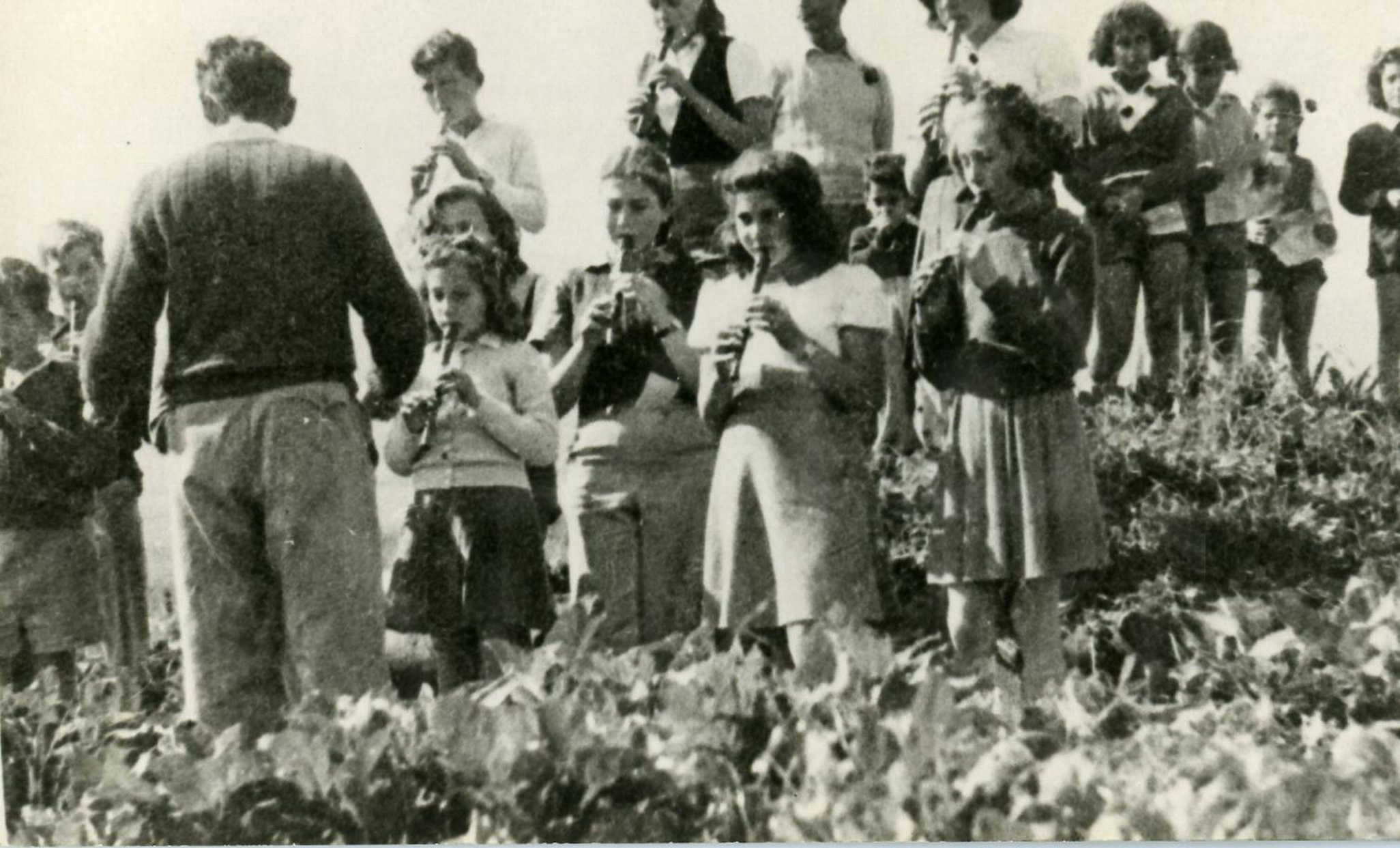 ילדי מחזור אורן ואלון מופיעים בחליליות משמאל למעלה יעקב שרגא חבר בית השטה- שורה תחתונה באמצע ברכה דגני- זימרה קלבנסקי וניצה שושני1946