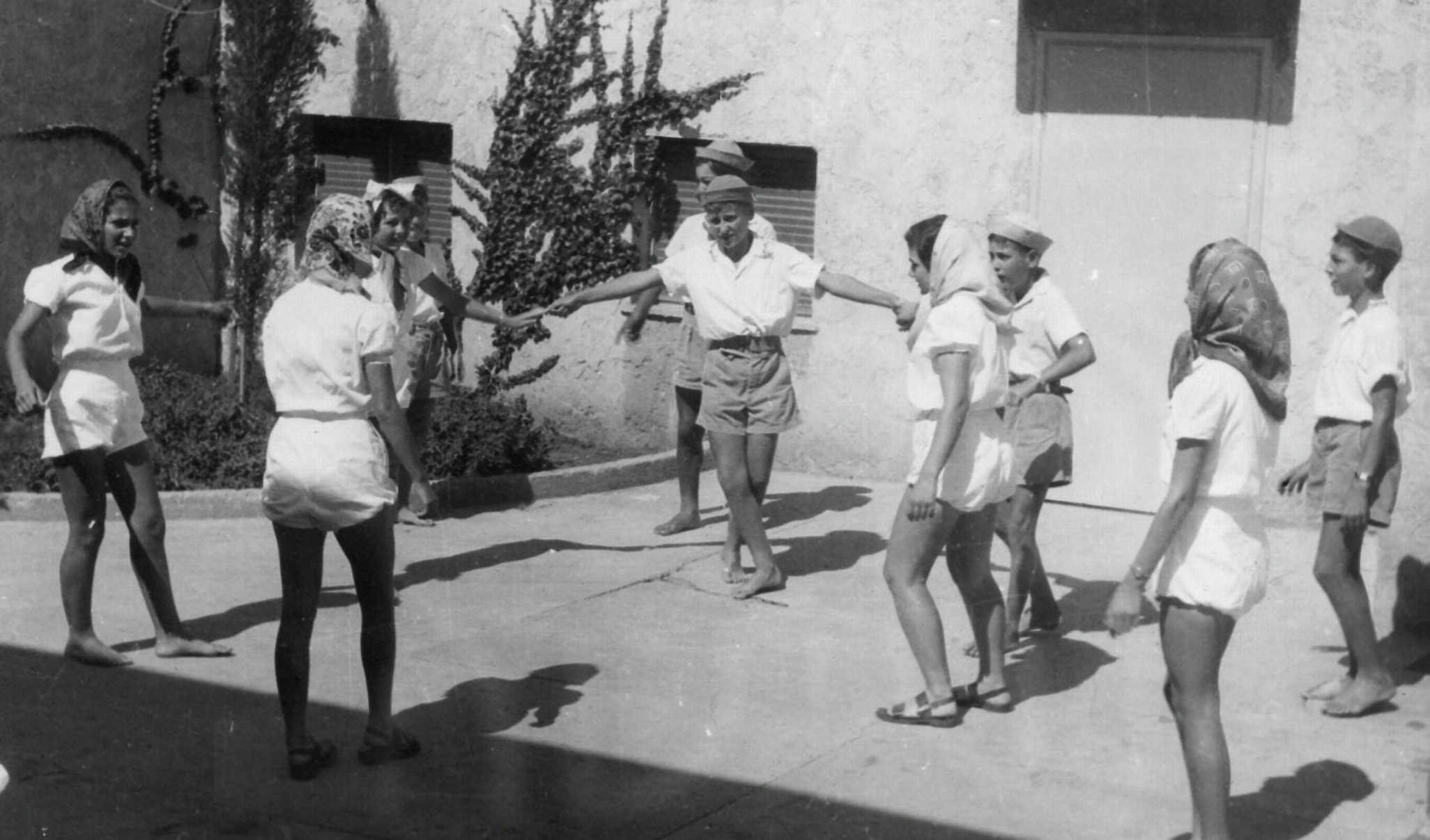 רחבה בין הבתים הכוללים- רקדני כיתת ‘להבה’- במרכז אפריים- מימין אהוד – 1949