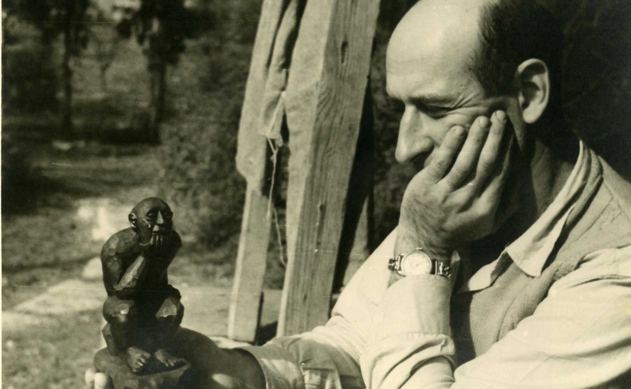 הפסל- נגר- צבי רותם עם פסל ‘האדם החושב’ שלו .-1953