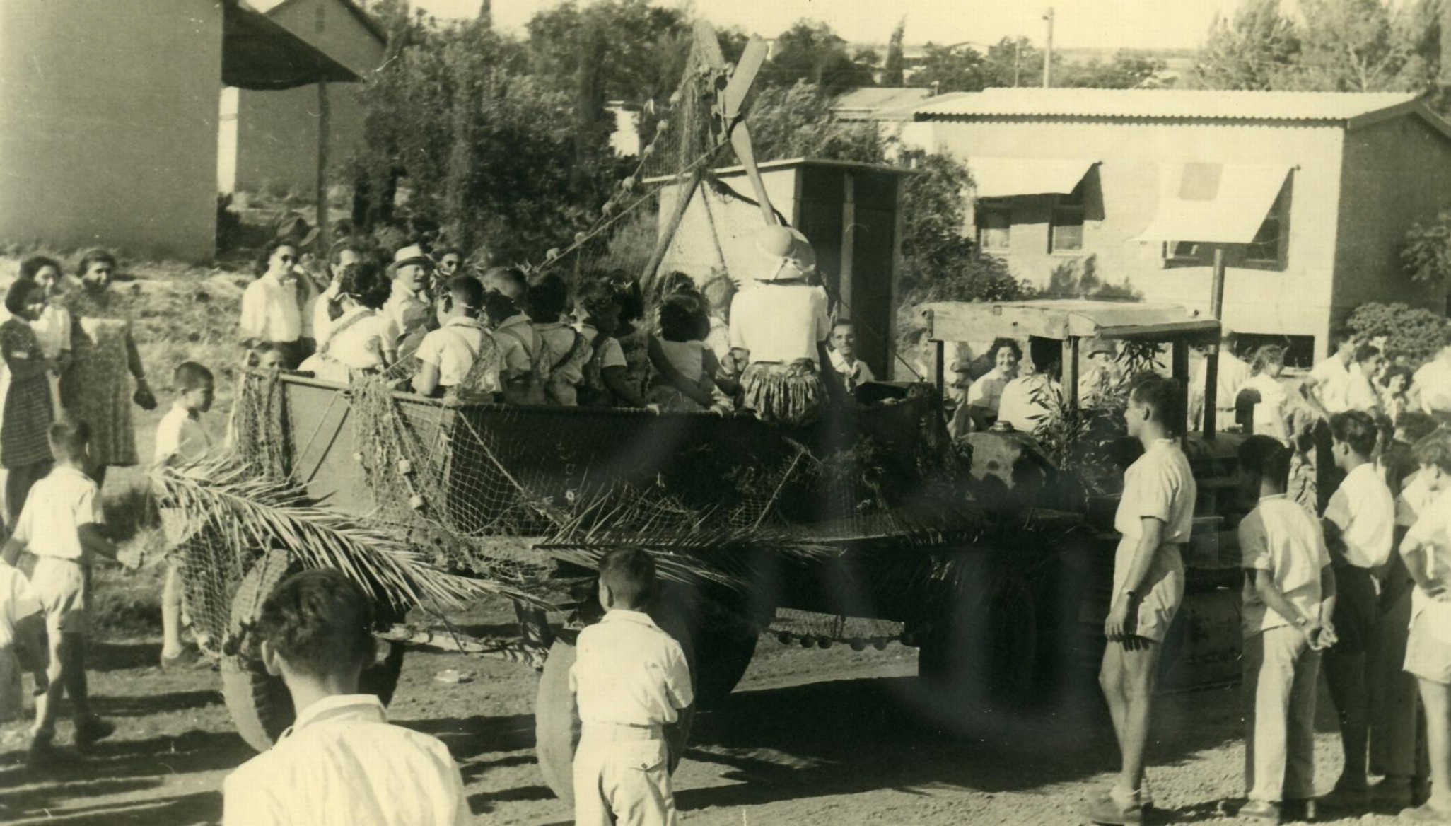 תהלוכת שבועות בית השטה- ילדי כיתת ‘כפירים’ בעגלה – 1953