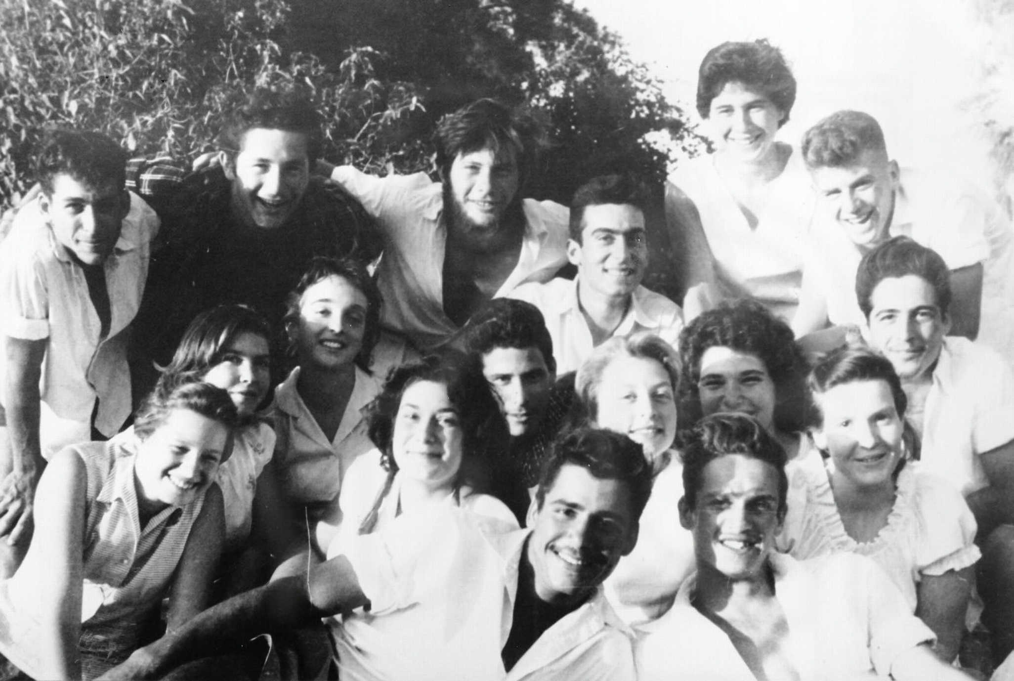 כיתת ‘אילה’ בסיום בית הספר -נורית ירחי-מתניה בן יעקב- ראובן דובג’ינסקי-עוזי אילת-עמוס נאמן-כרמלה גוריון-חיים רודד-שולה גורן-אפרת שטיקלר-עדנה סבירבקי-נירה מלר-בועז שמש-אבי לווי-ניר גוטמן-הדס פלד-יהודית צצקס – 1958
