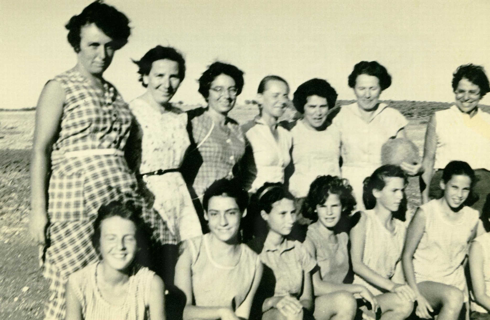 בר מצוה כיתת ‘רקפת’ עומדות אמהות:מרים כהן- אסתר גלבע מטפלת- שרקה כהן- מרים חצרוני- עליזה קורן- רגינה אריך- מרים ברונשפיגל. יושבות הבנות: חנה סנדברג-. שולה-אדר- יעל נאמן– בתיה קיקיון- רות חצרוני-תרצה אריך-1957