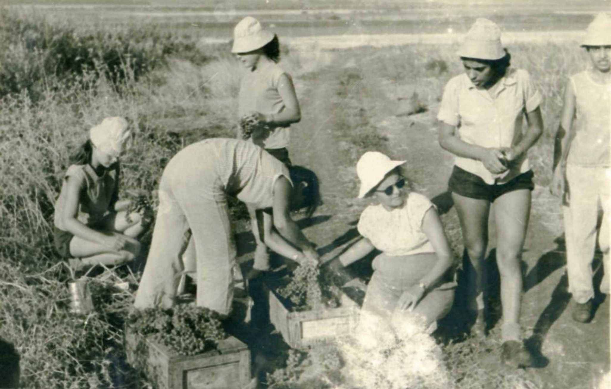 בציר ענבים- גיוס ילדי בית הספר והמורים בבוקר לפני הלימודים- יעל מדני- אסתר שירחון ומרתה מכיתת יחדיו עם תקוה שריג המורה-1958