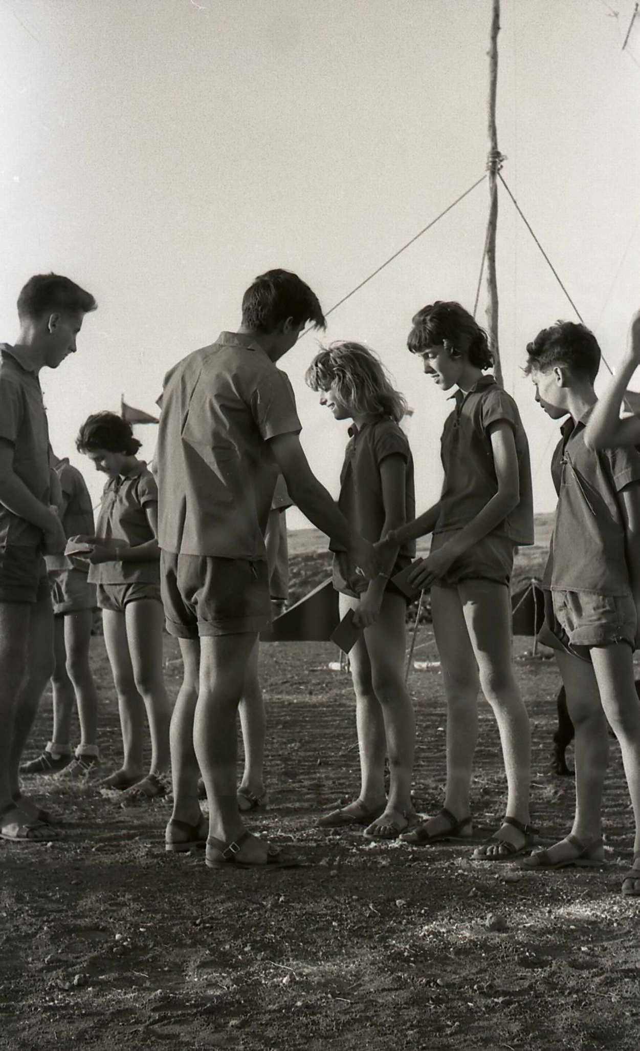 כיתת “כפירים” במפקד כניסה לחטיבה. המדריך שרגא גופר. החניכים יעל סבירסקי,שרה אדר. 1958