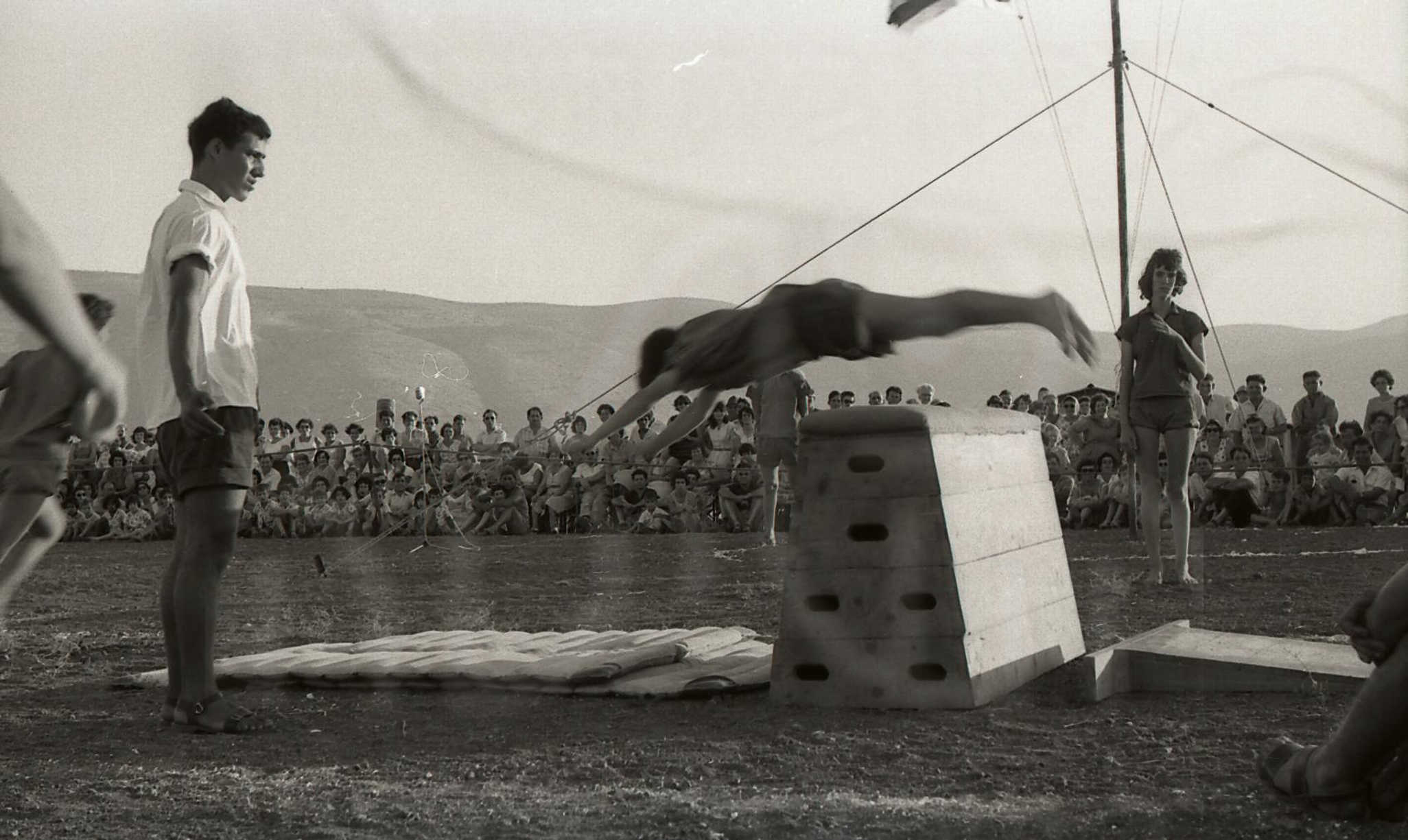 ביום העצמאות.התלמידים בתרגילי התעמלות לפני ההורים הצופים במגרש, המורה להתעמלות -יחזקאל דורי . 1958