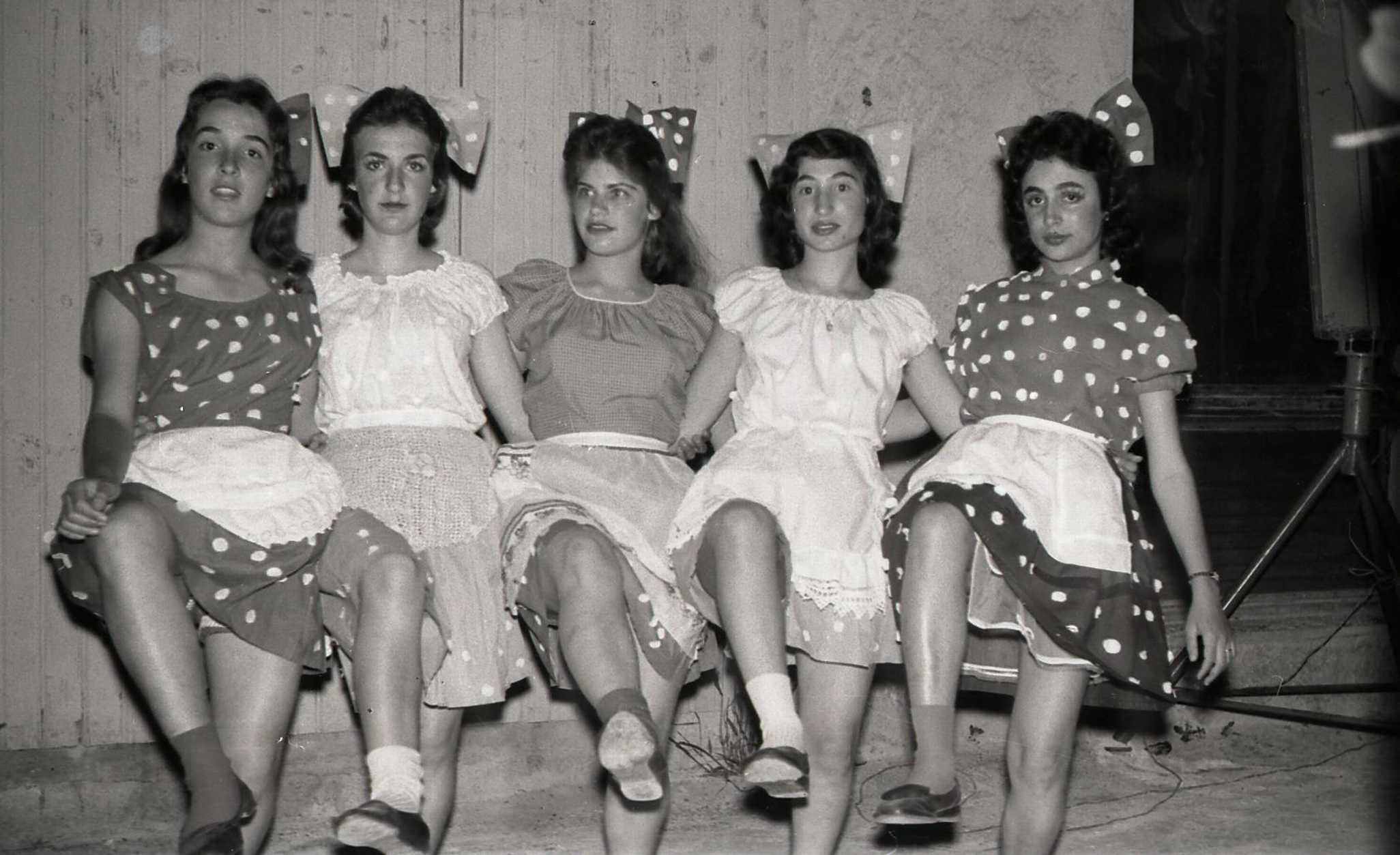 פורים חברים ובית ספר.אפרת שלם-שלומית ויינשטיין-יעל נאמן-תרצה ארייך-לאה גורן-בנות רקפת – 1959″