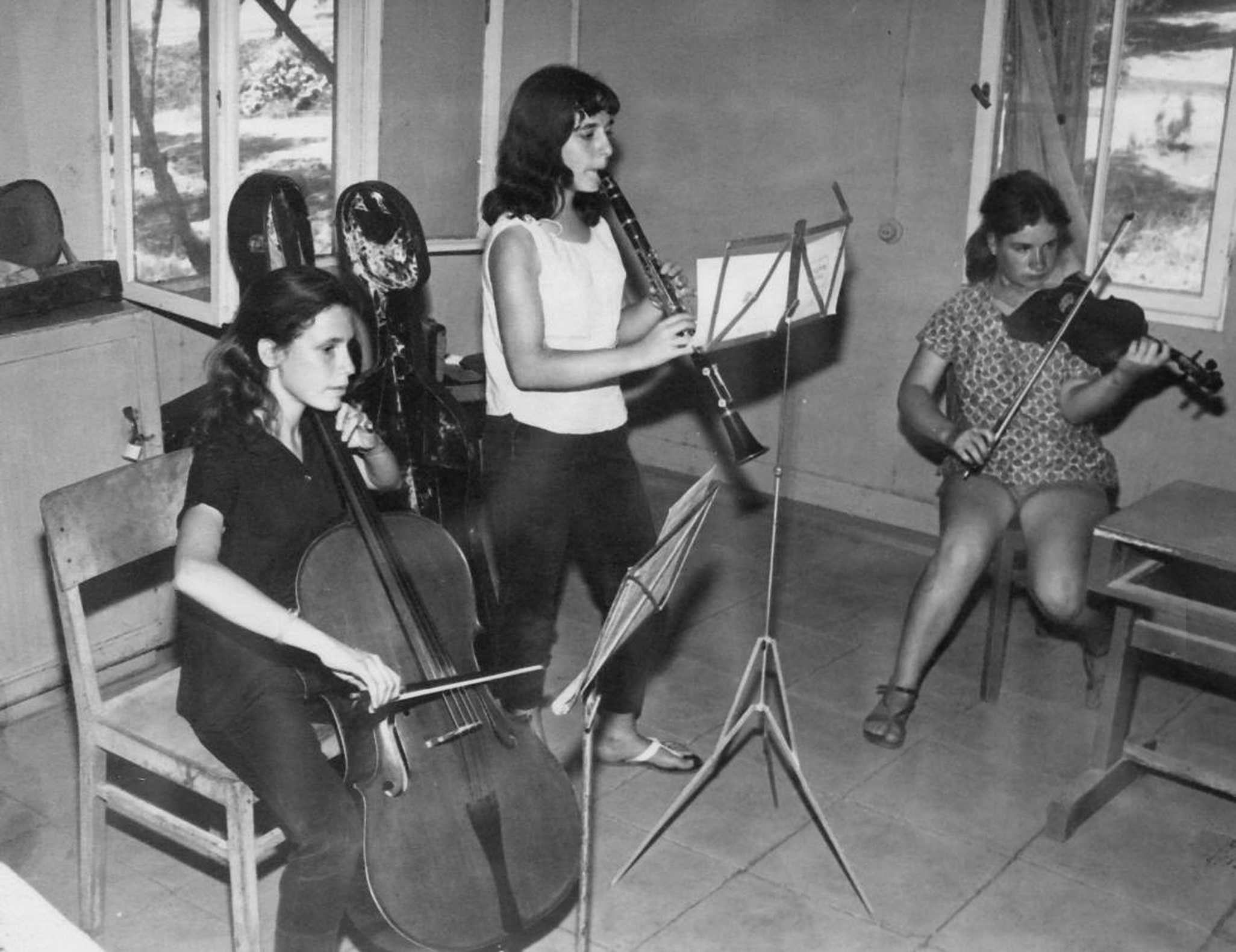 חנה כהן מנגנת על צ’לו- חוה דובניקוב על קלרינט ונעמי ברונשפיגל בכינור – 1960