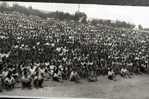 ביציע הקהל צופים בסדר מופתי 1600 המוזמנים לעצרת הראשונה של חטיבת בני הקיבוץ המאוחד – 1951