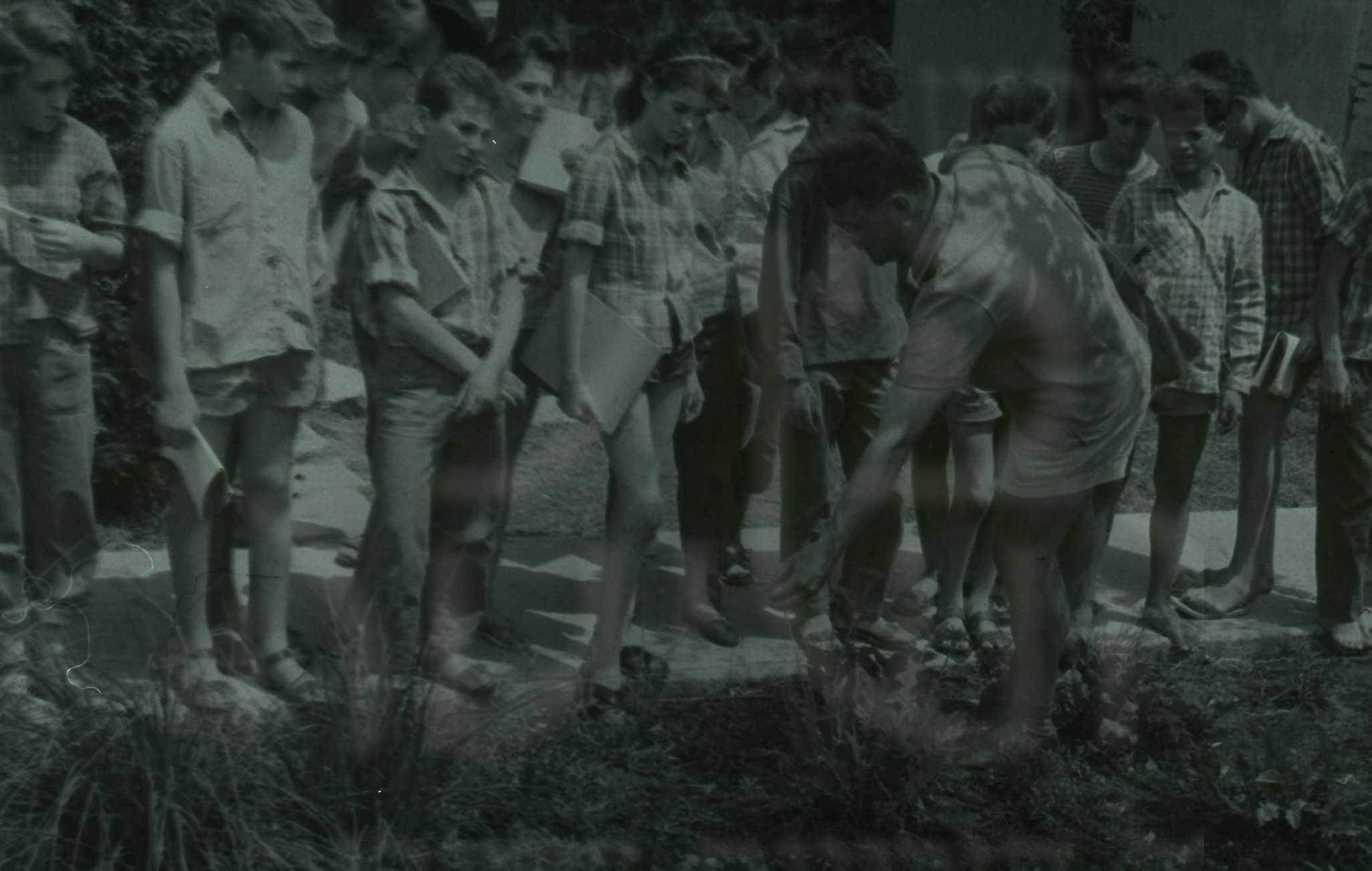 כיתת ‘אבוקה’ מקבלת הסבר מעזריה אלון על צמחים- גרשון דוד- זאב קיטישבסקי- חנה שלו – יאיר צמרת – 1965