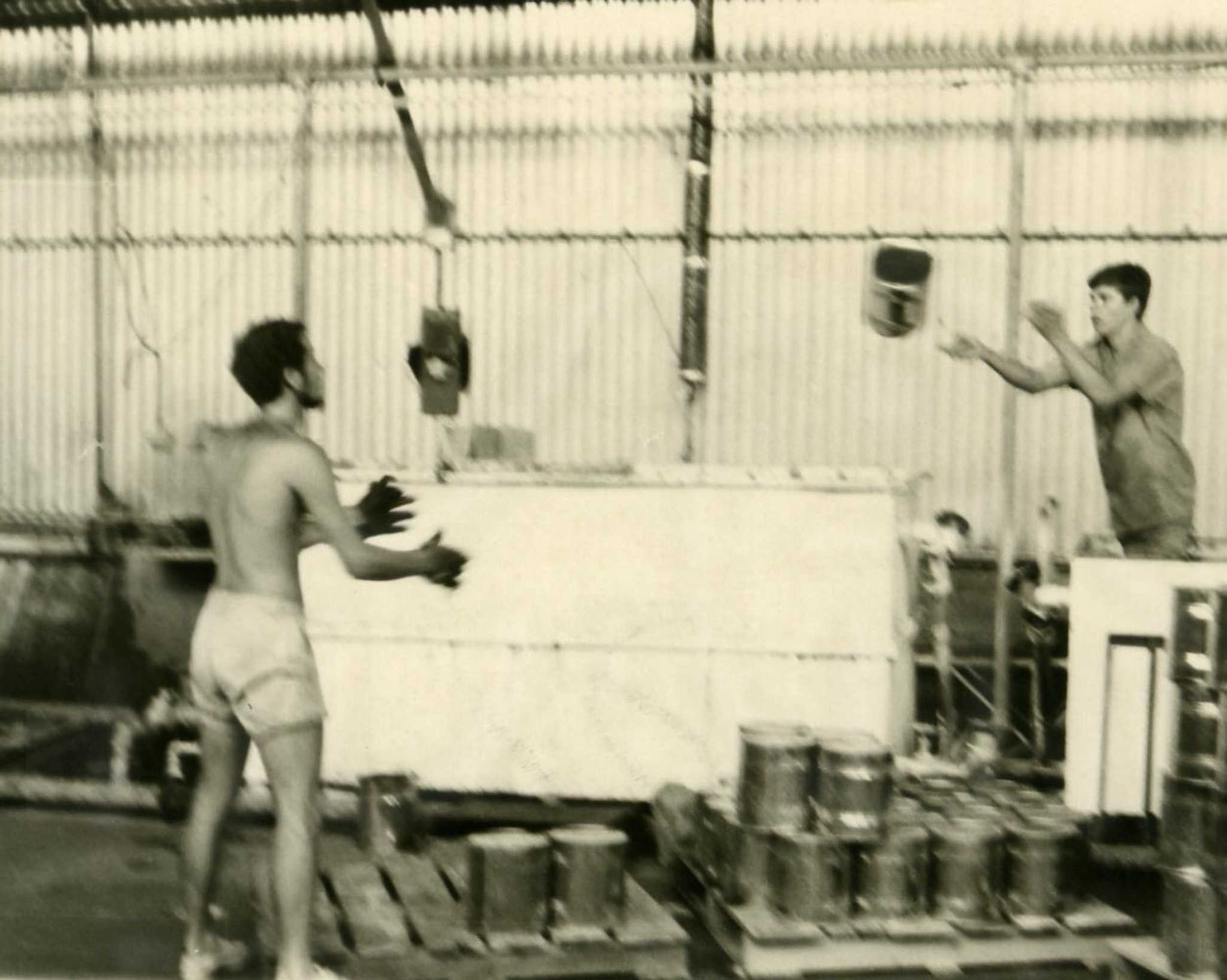 שאול נאמן וחבר, מעבירים קופסאות 9 ליטר לפיסטור . 1963