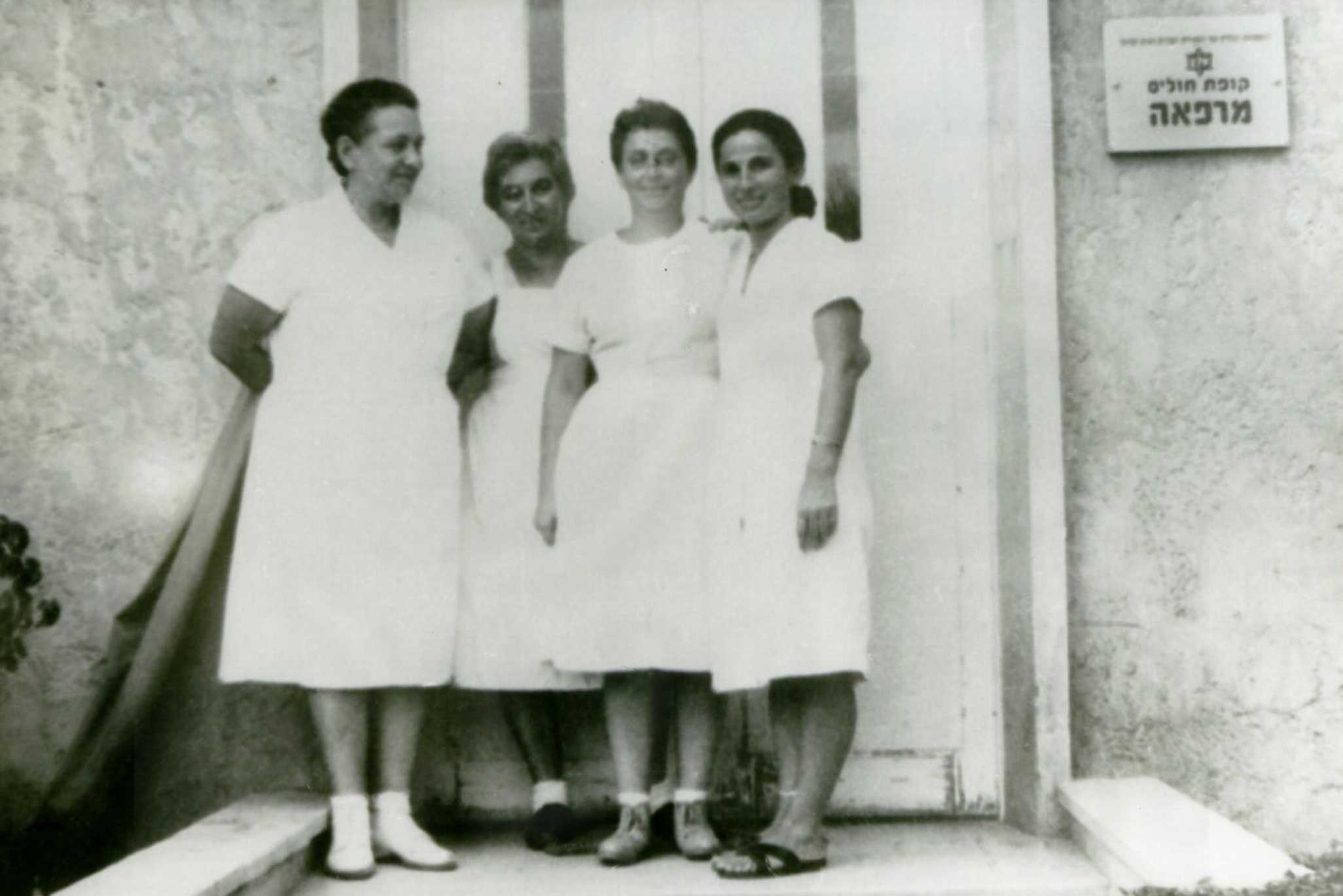 צוות האחיות בפתח המרפאה: מימין חנה טל- חוה ברק- לוטה מחדר חולים ויהודית שושני הוותיקה-1966