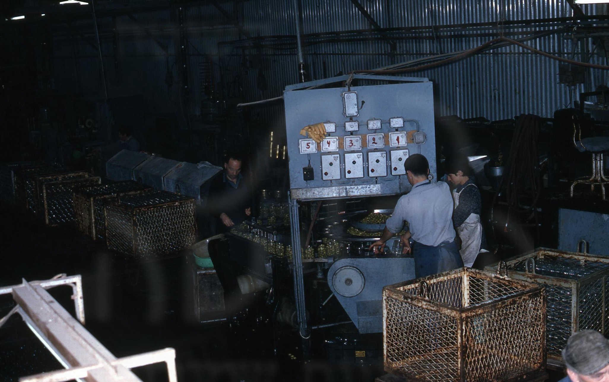 זיתיה.קו הצנצנות. מילוי זיתים בצנצנות והעברתן לסלים לצורך פיסטור. עדין לא היה פיסטור רציף לצנצנות. 1968