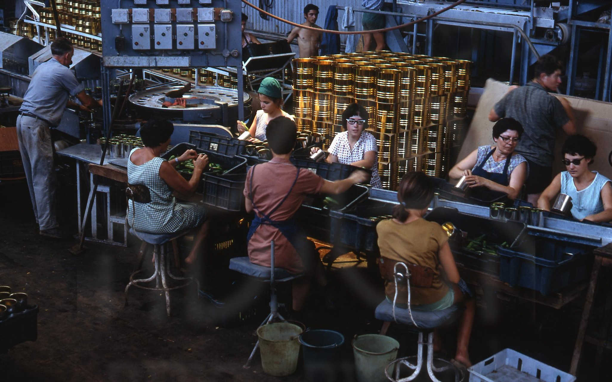זיתיה.קו מיון ואריזה 9 ליטר, פנינה זידל,רבקה לב, רותי גורן ,ניצה אגוזי ,אורי גוריון ואחרים  בעונת המלפפונים. 1968