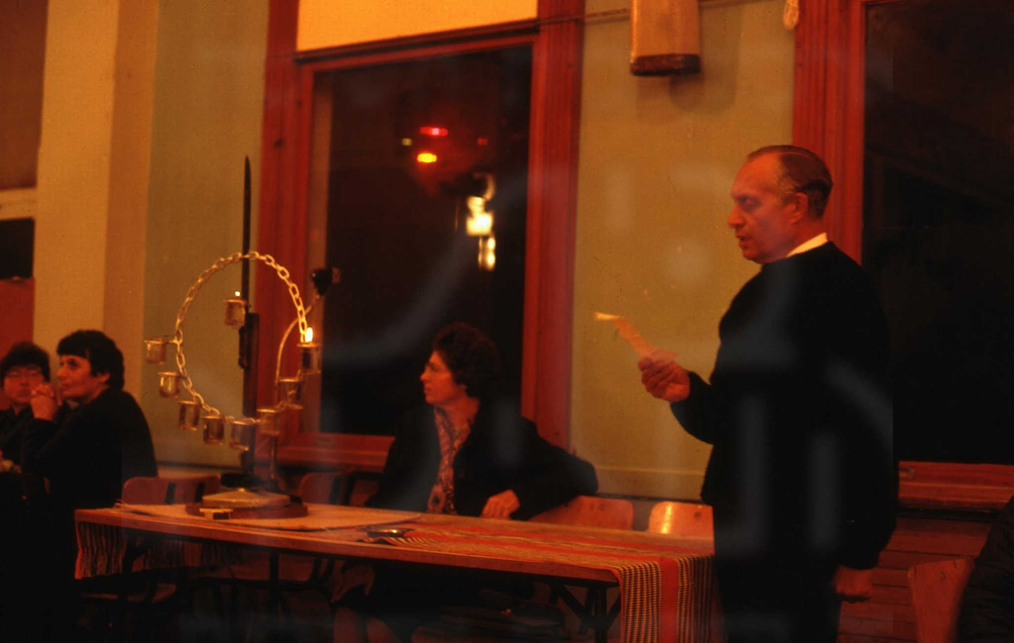 חנוכה- שמעון דגני מברך על הנרות בחדר אוכל- ברכה אשכנזי- דינה שרון- אלינור פורת-1969