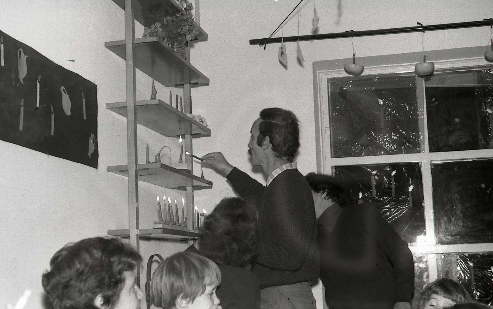 חנוכה בגנים-ראובן שטרן מדליק חנוכיה -1969