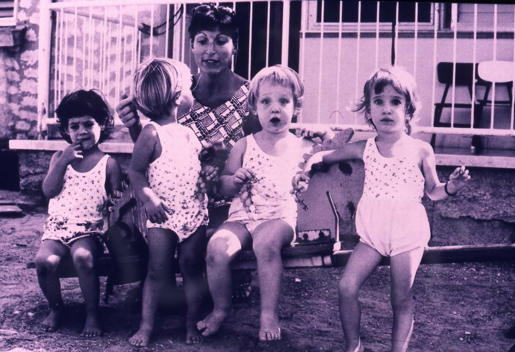 ניצה גופר מטפלת בפעוטון- מימין שירה מרוז- סער אהוביה- יותם ענתבי- וענבל ארגוב- 1976