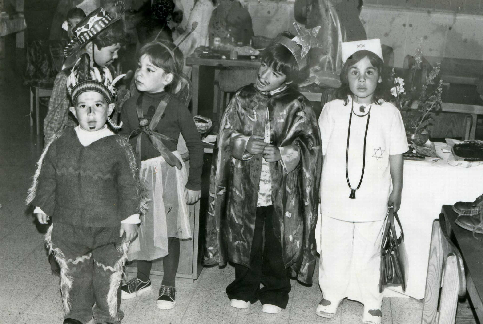 פורים בגן ג’ משמאל תומר עילם- מיה פורת, תומר אילת ולימור פלג – 1978