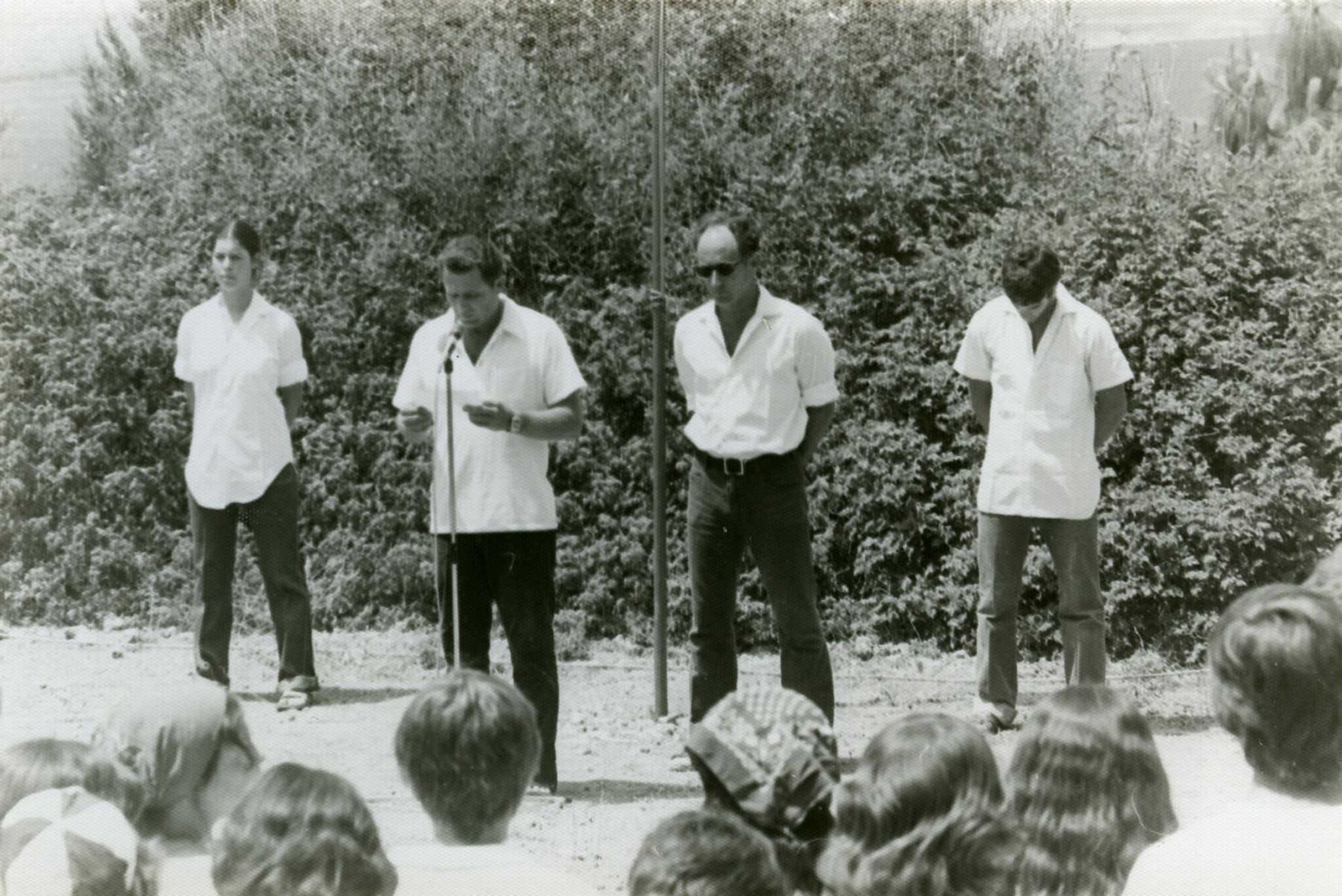 מפקד יום הזכרון בבית עלמין בית השטה. ליד המקרופון יעקב שרגא- שרגא גופר- אפרת רפאלי-1978