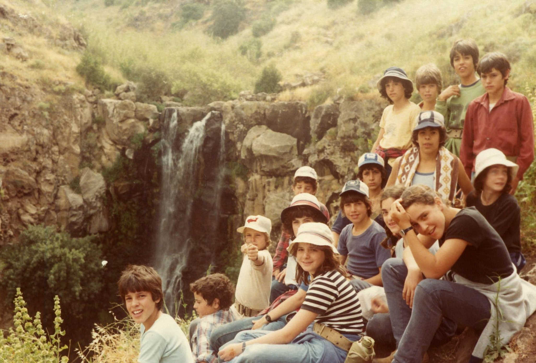כיתת ‘צבר’ בטיול שנתי- נחשון ארגוב- אסא לוי- צור אדר- נועה אורי- אלה כהן- ישראל- אלון סולימן- יפעת שטרן- רני פלג- עפרה סינטו- גור מרוז- רונן ריגלר ורני פלד על שפת מפל התנור-1982