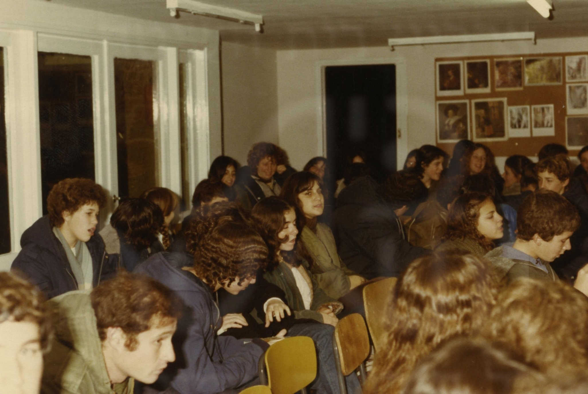 פעילות חברת הילדים- שיחת תא – עינת גוטסמן- מיכל גת- נגה דורי- יורם ויצמן- בכניסה לבית הכיתות. 1982