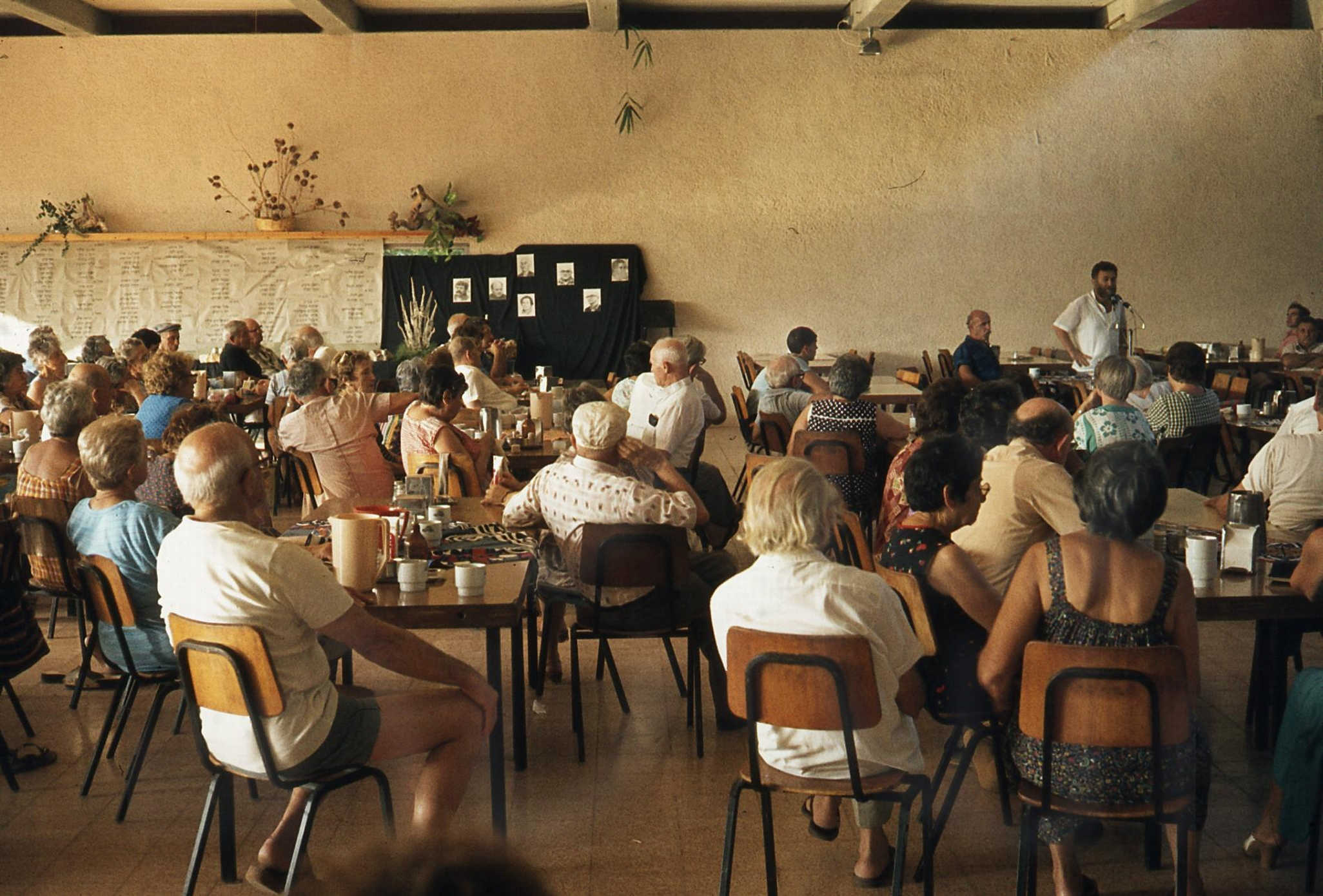 יום כיפור- אספה שנתית- חיים שניר מדבר- מיכאל ירבעם לידו- מהגב – דינה ועדי שרון- ברוריה ואריה ב.ג. מרים חצרוני- ברקע רשימת הנפטרים של בית השיטה.- 1984