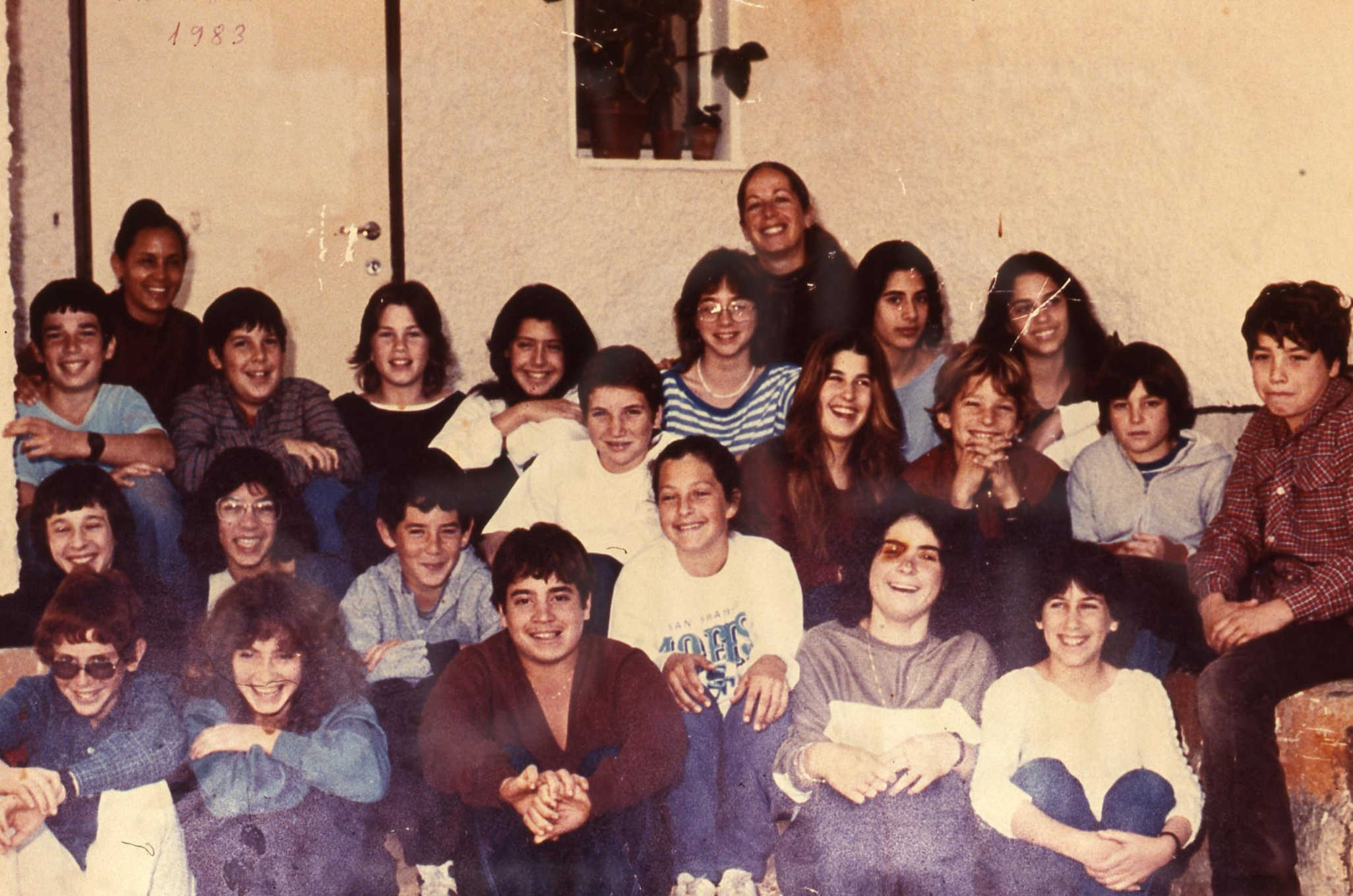 כיתת ‘יובל’ עם המורה רותי פלד והמטפלת בתיה לוטן. 1986