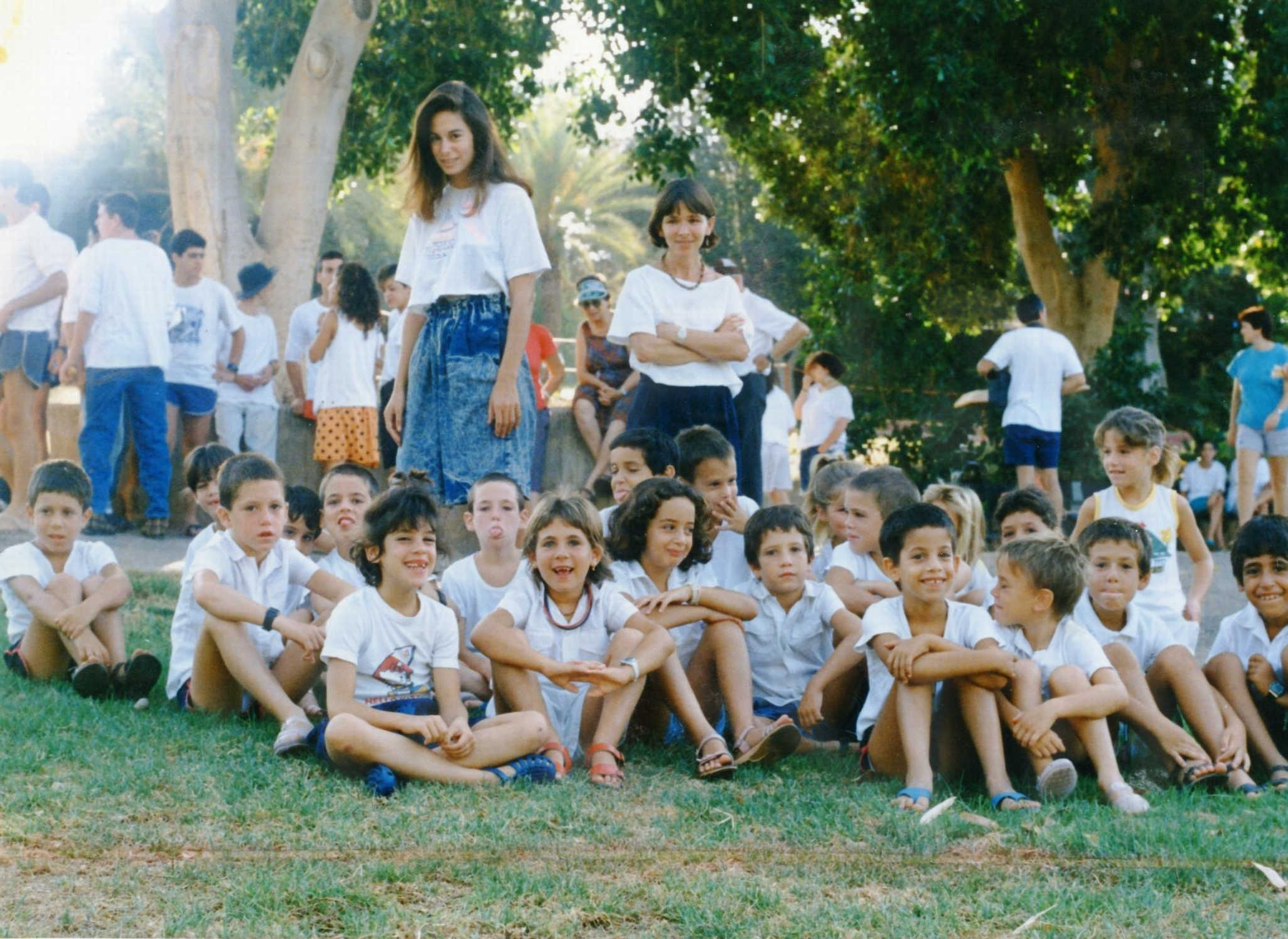 כיתת ‘רעות’ עולה לכתה א’. המורה תמי אלון- יושבים על הדשא במפקד פתיחת שנת לימודים- שני תורג’מן- מעוז ארד- גור לידן- אלון רבינוביץ- פלג- יובל הינמן- ניר לוי- תום- אדוה- אבנר דרור- יונה ריין- זיו ארנון-בן שריג – 1988