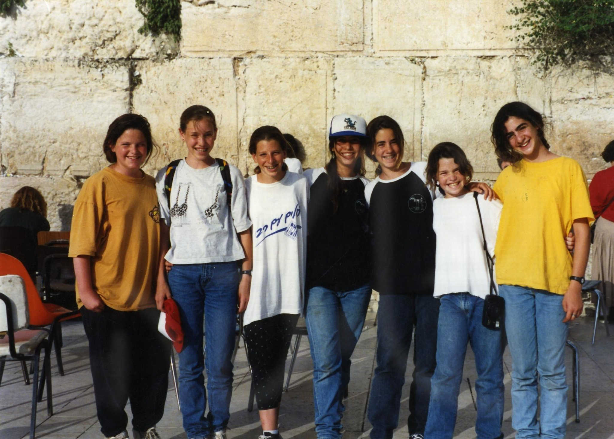 בנות כיתת ‘שחר’ ליד הכותל בירושלים- רוני פורת- אפרת דרור- הילה אוחיון- מיכל לוי- עמית שולמי- מרוז ריניץ- רות אילת. 1991