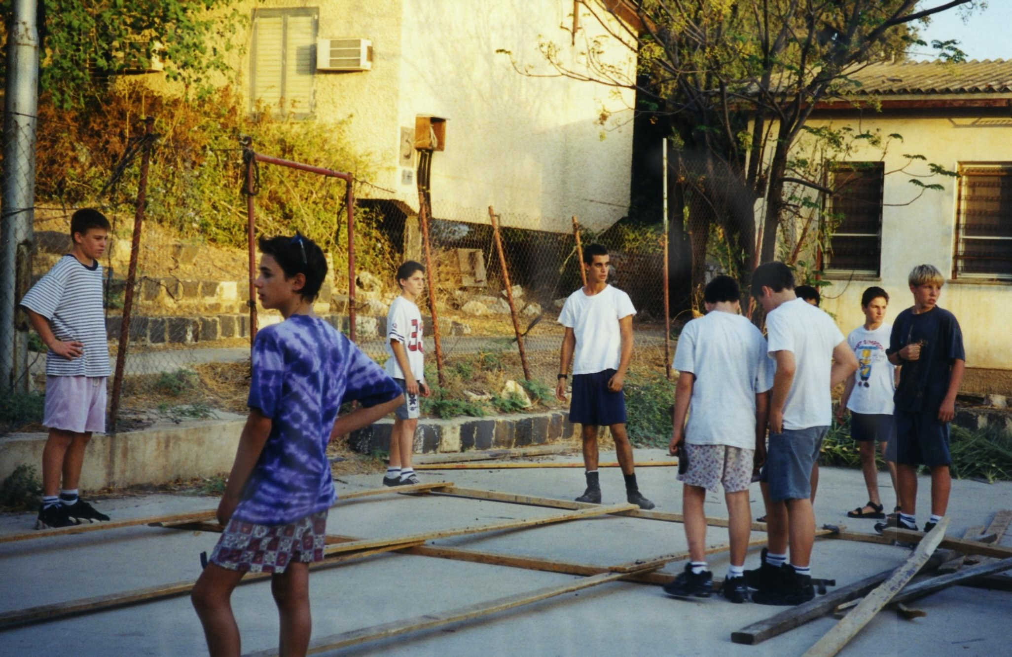 פעילות חברת הילדים- בניית הסוכה על המגרש ליד ברכת השחיה.1999