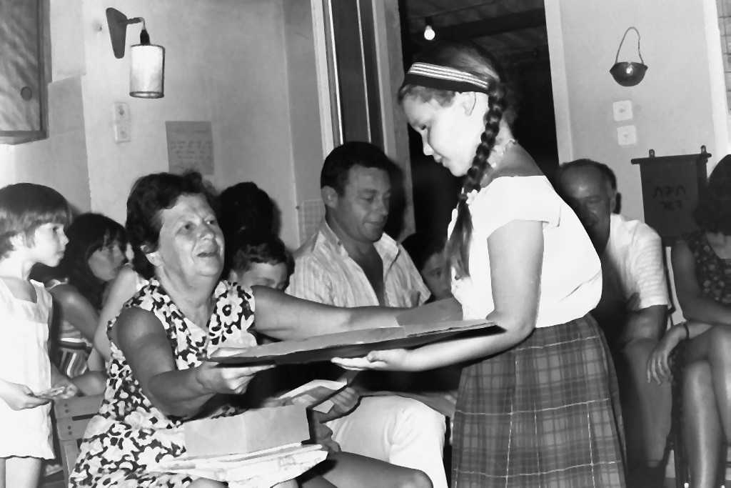 גילה כרמל מקבלת תעודה במסיבת סיום גן ה’ ,שיפרה גדרון הגננת- 1968