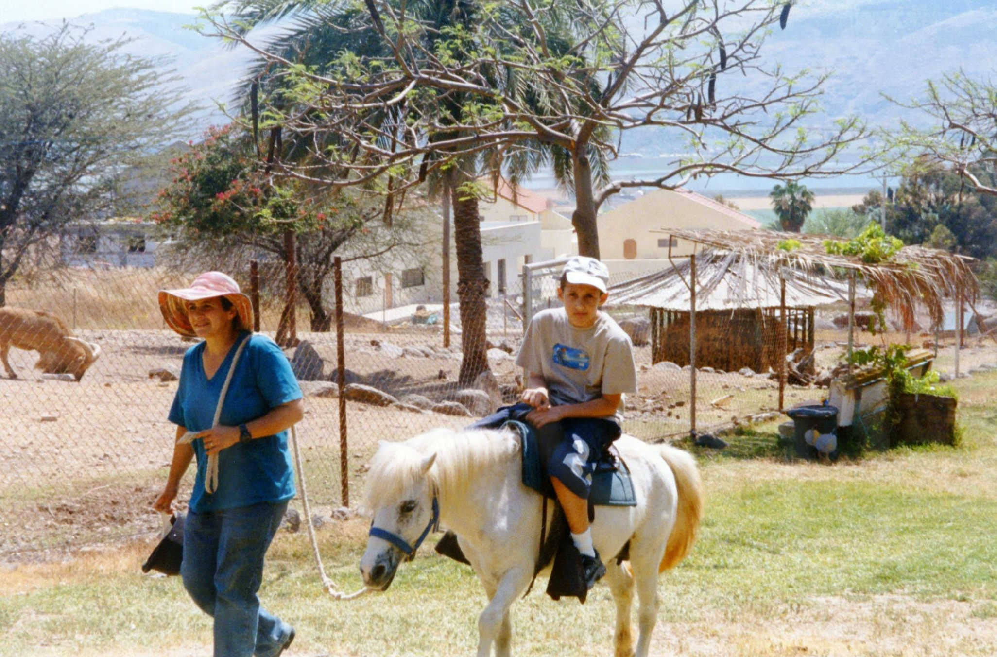 משק חי בית השטה דליה צבי מוליכה את הפוני עם רוכב קטן.2002