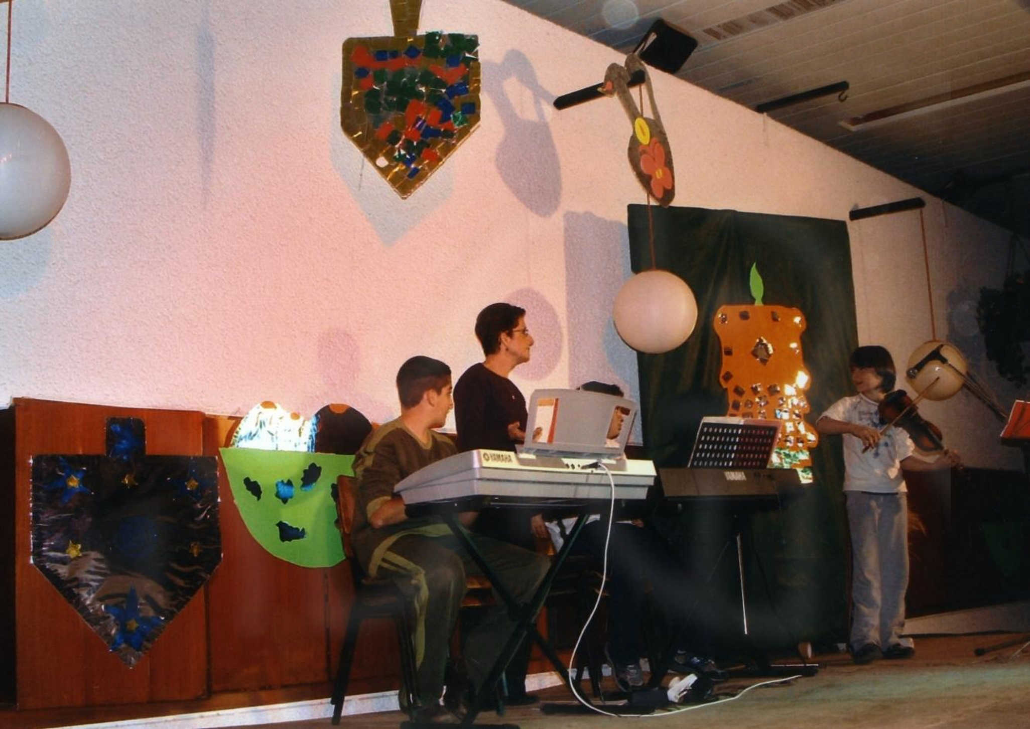 מסיבות חנוכה בחדר האכל- חוה הדר ואוהד רודד מנגנים-2004