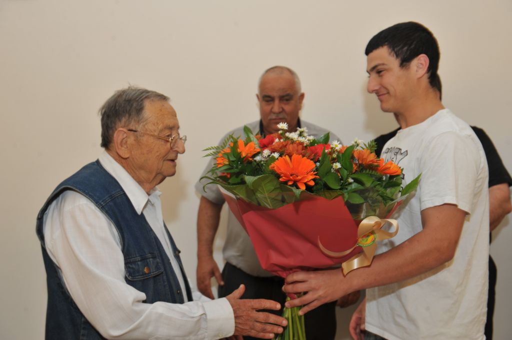 עזריה אלון מקבל זר פרחים מחניך תנועת הנוער בטקס במועצה האזורית גלבע.